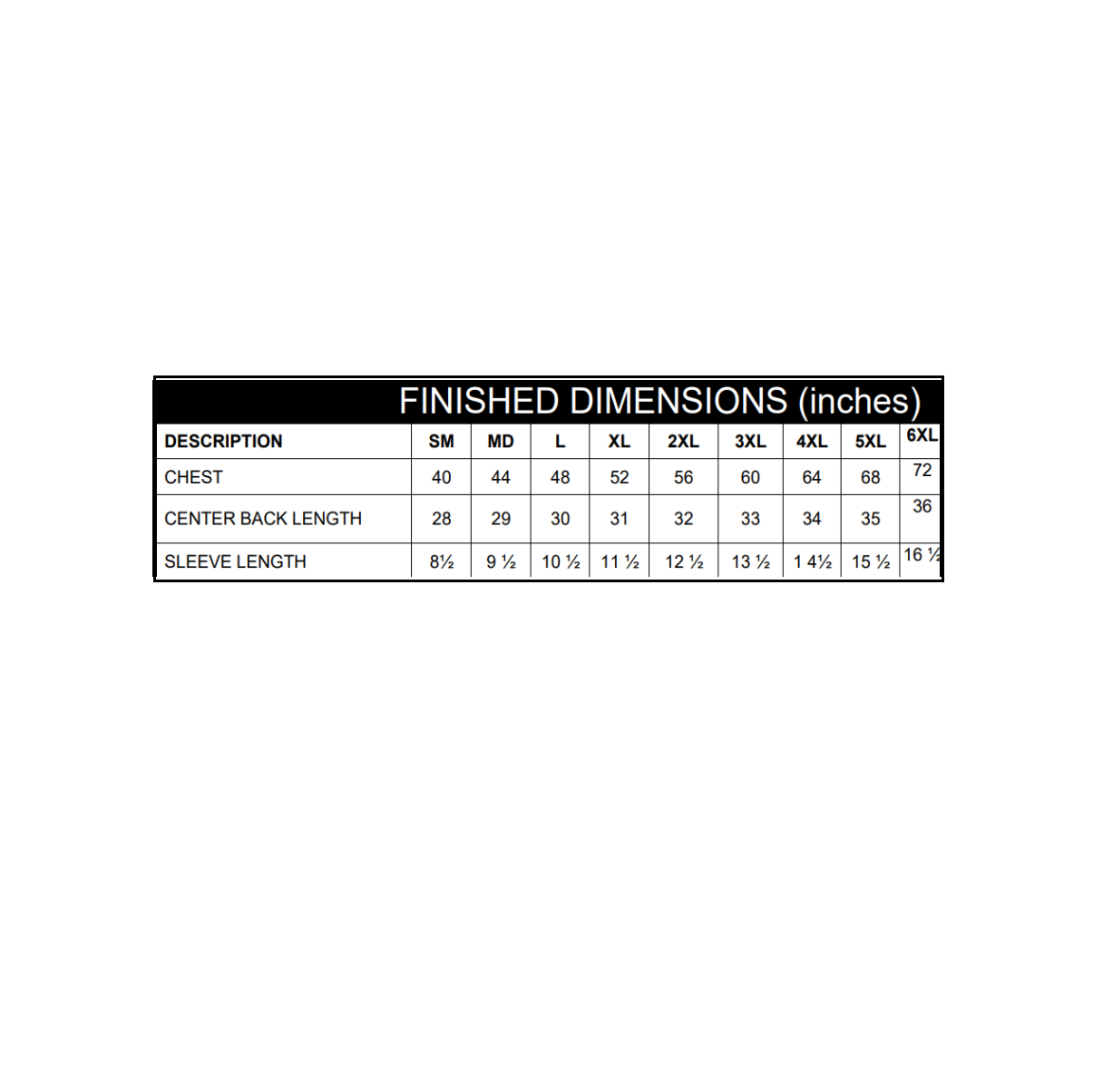 S-6XL (upcharges apply for 2XL-6XL)